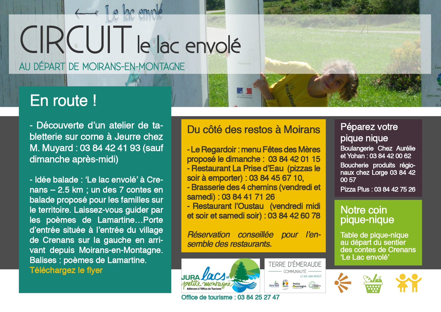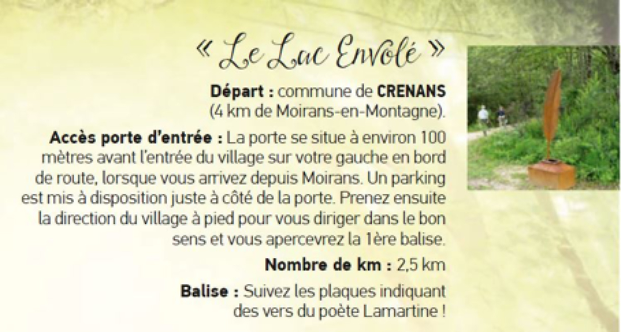 – Idée balade : ‘Le lac envolé’ à Crenans – 2.5 km ; un des 7 contes en balade proposé pour les familles sur le territoire. Laissez-vous guider par les poèmes de Lamartine…Porte d’entrée située à l’entrée du village de Crenans sur la gauche en arrivant depuis Moirans-en-Montagne. Balises : poèmes de Lamartine.